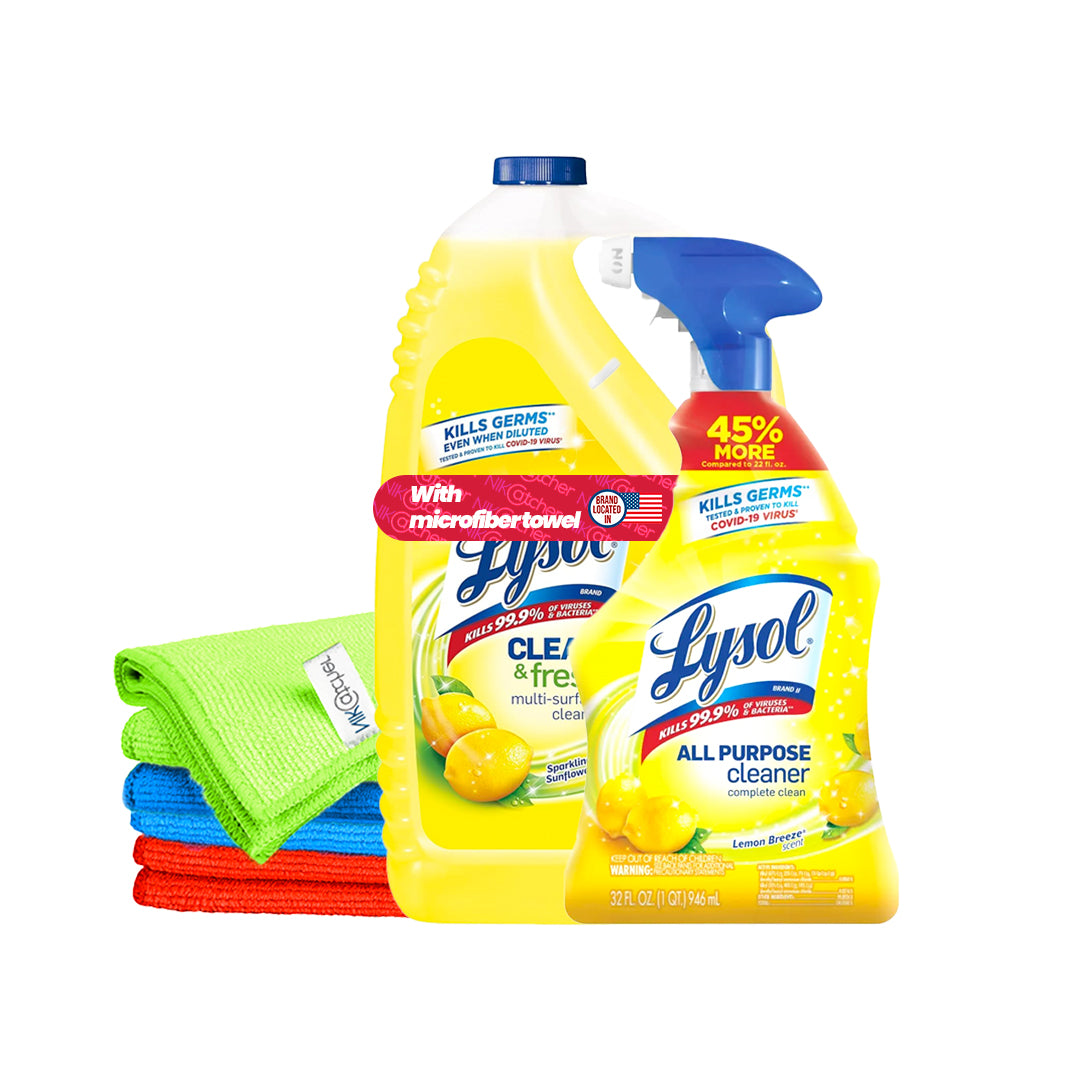 Lysol All-Purpose Cleaner (32 oz Trigger Bottle + 144 oz Refill, Lemon Breeze) with NikCatcher 16x16" 400 GSM Microfiber Cleaning Cloth Bundle (Color May Vary)
